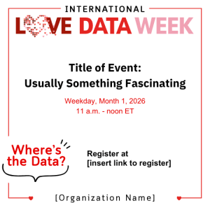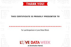 A curated list of free, customizable promotional materials — like social media graphics, Zoom backgrounds, stickers, and activity ideas — to help institutions and individuals raise awareness and engagement for International Love Data Week. Ideal for event organizers looking to easily amplify data literacy initiatives, coordinate outreach (e.g., through copy‑and‑paste posts or certificates), and foster a fun, community‑wide celebration around data.