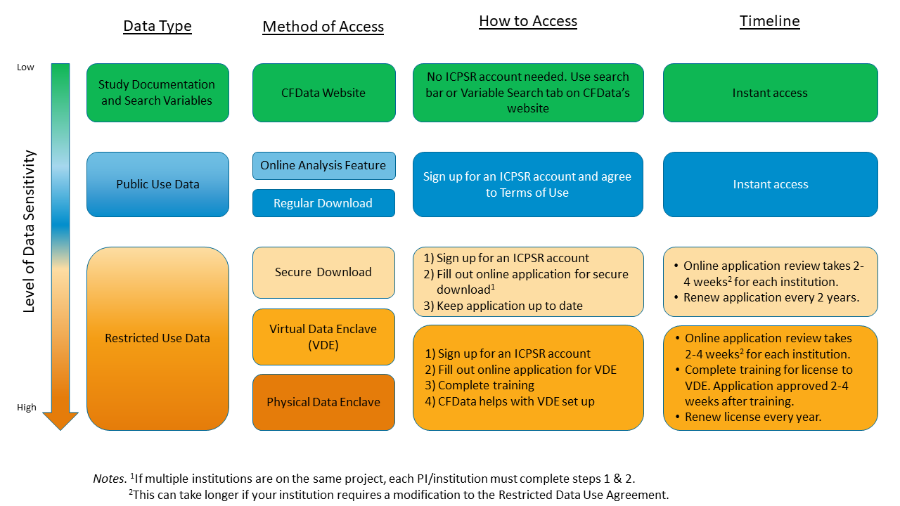 Some of the data archived at CFData contain sensitive information and require more protections and security to access and use the data. See ICPSR 101: What is Restricted-use Data? video for a quick overview of restricted data.