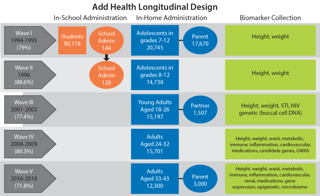 Add Health consists of five waves of data. Each wave combines longitudinal survey data on respondents’ social, economic, psychological and physical well-being with contextual data on the family, neighborhood, community, school, friendships, peer groups, and romantic relationships, providing unique opportunities to study how social environments and behaviors in adolescence are linked to health and achievement outcomes in young adulthood. Multiple datasets are available for study from each wave of data, providing opportunities to increase knowledge in the social and behavioral sciences and many theoretical backgrounds.