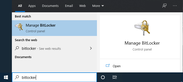 Select Manage BitLocker from the list of search results on the left-hand pane. Alternatively click the Open icon in the right-hand pane.