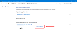 In the BitLocker Drive Encryption window select the removable storage device that you want to encrypt and click the Turn on BitLocker button for that drive.