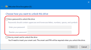 A new window will prompt you to select the method to be used to unlock the removable drive, once encrypted. Select “Use a password to unlock the drive.” Enter the password twice. Store your password securely.