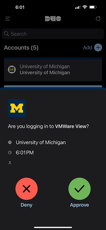 5. If you chose a push notification: Once the Duo app is open, click the green ‘Approve’ button. You will then automatically be logged in. If you receive a push notification when you did NOT attempt to login, press the red ‘Deny’ button to deny access.