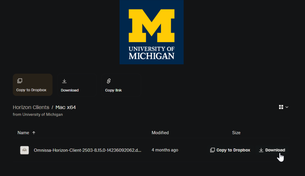 - First, download the Omnissa Horizon Client Installer from the University of Michigan MiDesktop Dropbox Folder. You will want the most recently modified file as that is the newest version of the client.