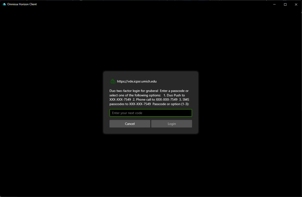 3. A dialog will prompt you for your username and a passcode. The passcode is your password that was provided by UM staff. Click the Login button to proceed.