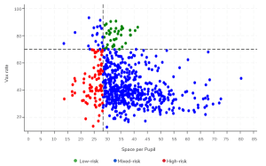Scatter plot titled “Elementary Schools” showing data points for vaccination rate (y-axis) versus space per pupil (x-axis). Data points are categorized into three groups: low-risk (green dots, in the upper right quadrant with high vax rate and high space), mixed-risk (blue dots, scattered mostly in the mid-range of both axes), and high-risk (red dots, in the lower left quadrant with low vax rate and low space). Dashed lines indicate a vaccination rate of 70 and space per pupil of 28. Legend at the bottom identifies dot colors for low-risk, mixed-risk, and high-risk categories.