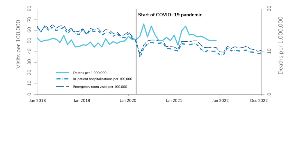 A line graph labeled “Trends in opioid use disorder-related emergency room visits, hospitalizations, and mortality among all Medicare fee-for-service enrollees.” The graph illustrates trends in deaths per 1,000,000 (solid blue line), hospitalizations per 100,000 (dashed blue line), and emergency room visits per 100,000 (dashed black line). The graph has two x axes, one on the left labeled “Visits per 100,000” ranging from 0 to 80 in increments of 10 and one on the right labeled “Deaths per 1,000,000” ranging from 0 to 20 in increments of 10. The y axis represents months from January 2018 through December 2022. OUD-related deaths per 1,000,000 range from about 10 to 15 before March 2020. After March 2020, the line peaks around 16 or 17 in May 2020, June 2020, and April 2021, then returns to baseline by December 2021. OUD-related inpatient and emergency room visits per 100,000 are each between about 55 and 65 before March 2020, reach a low below 40 in April 2020, increase again to about 50, then lower to 40 by December 2022. Overall, the graph illustrates that from the 2 years before the pandemic start to the 3 years after there was a 24% decrease in OUD-related ED visits, a 27% decrease in OUD-related hospitalizations, and an 11% increase in OUD-related mortality.