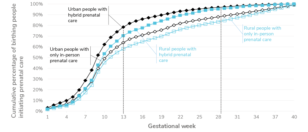 A line graph labeled “Urban versus rural prenatal care initiation.” The x-axis graphically displays gestational weeks from 1 to 40 in increments of 3 and the y-axis the cumulative percentage of birthing people in the United States initiating perinatal care from 0% to 100% in increments of 10%. The first line of urban people with hybrid care was the highest at 13 weeks compared with the rural people with hybrid prenatal care (the second line) but were similar by 28 weeks on to delivery. The third line of urban people with only in-person prenatal care was slightly higher than in rural people with only in-person prenatal care.