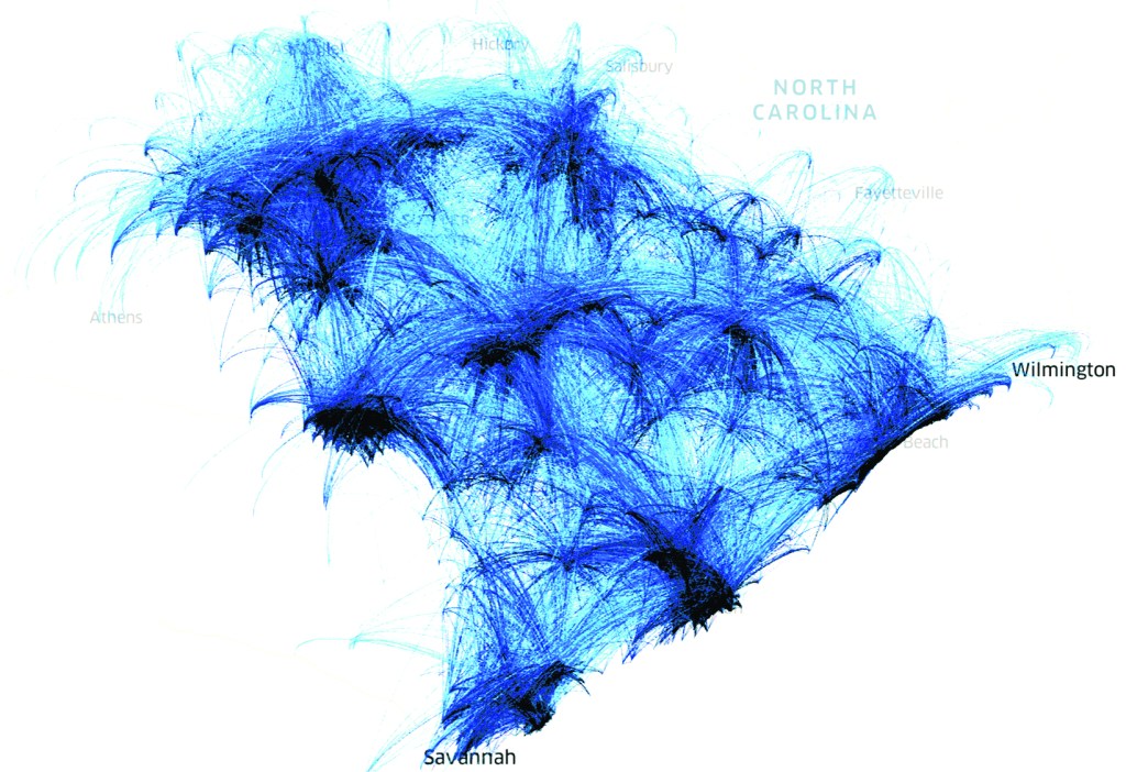 Visualization of the visitation flows from home blockgroup to over 3,000 fast-food restaurants in South Carolina in January 2019.