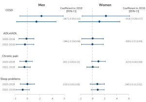 Figure displaying two sets of four horizontal error bar plots, one for men (left) and one for women (right), showing regression coefficients and 95% confidence intervals for changes in four outcomes (CESD, ADL+IADL, Chronic pain, Sleep problem) comparing years 2020–2018 and 2022–2018.